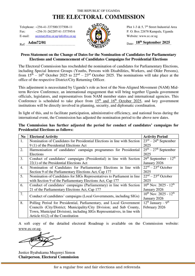 “The commission has rescheduled the nomination for Parliamentary candidates, including special interest groups (youth, persons with disabilities, workers and older persons from 15-16th October to 22nd-23rd October 2025”, Electoral Commission said in its release.