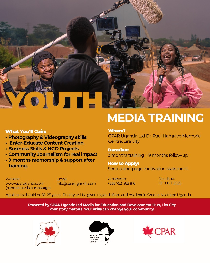 The program will run at the Dr. Paul Hargrave Memorial Centre in Lira City, starting October 2025. Interested applicants can apply via WhatsApp (+256 753 462 816), email (info@cparuganda.com), or the CPAR Uganda website (www.cparuganda.com). The application deadline is Friday, 10th October 2025.