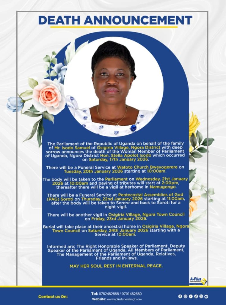Another funeral service will take place on Thursday, 22nd January 2026, at Pentecostal Assemblies of God (PAG) Church, Soroti, beginning at 11:00am. After the service, the body will be transported to Serere before returning to Soroti for a night vigil.